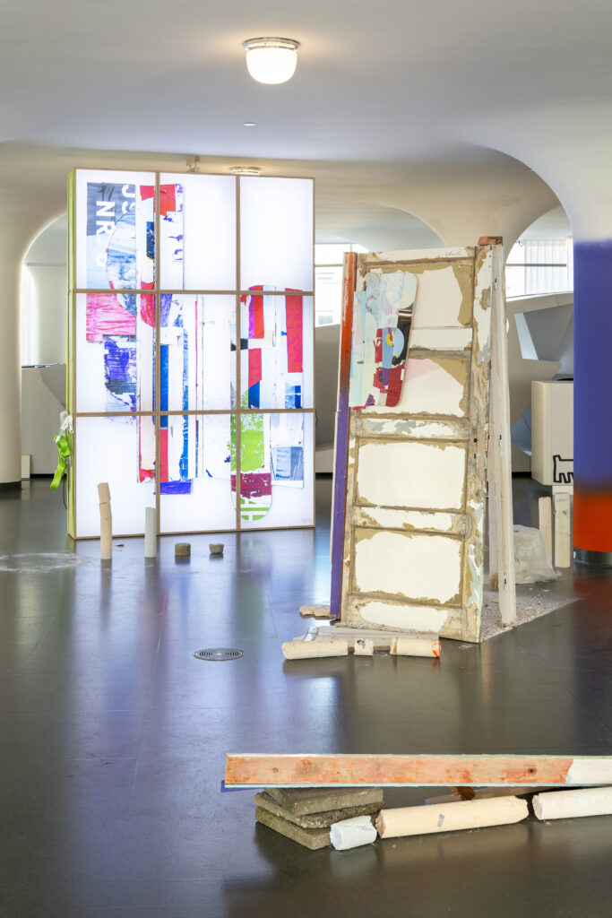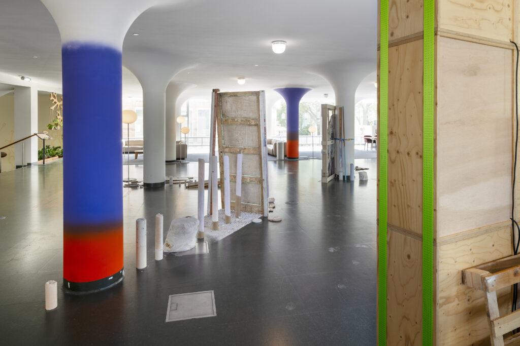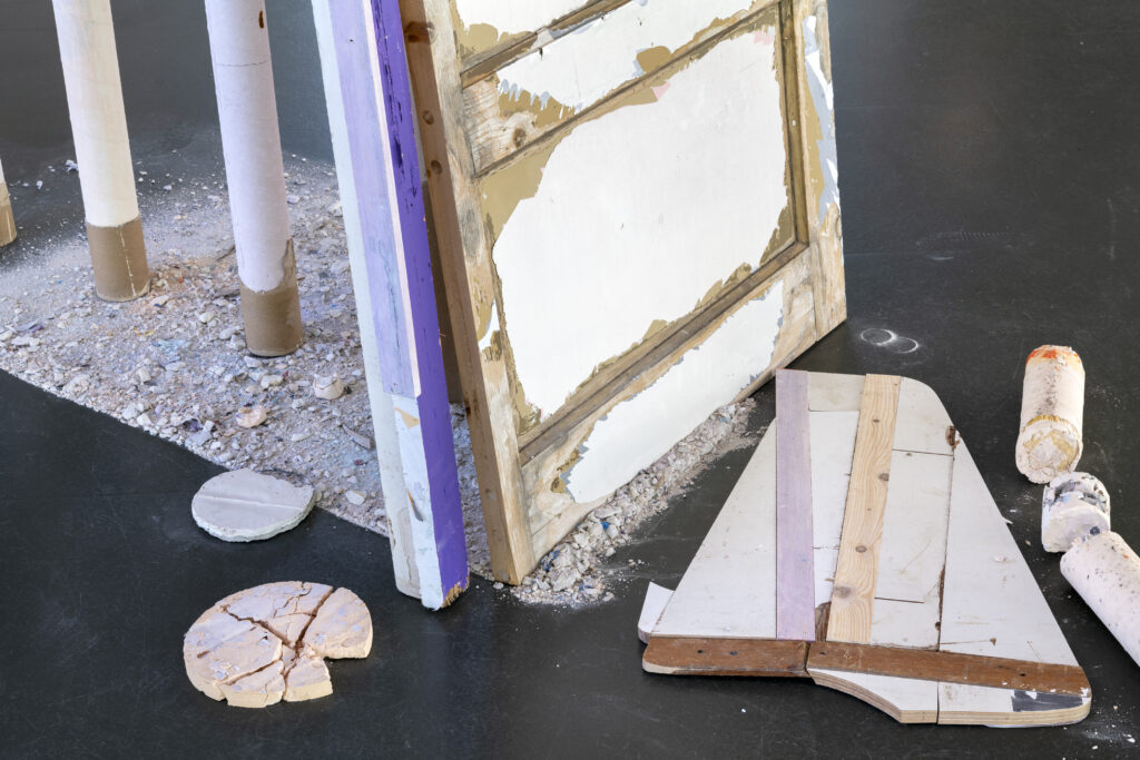 De beelden waren grotendeels werken ontstaan uit materiaal dat zichzelf had aangedragen. De transportkist en lichtbakken uit het depot van Schunck, regentonnen, resten van de verkiezingsborden van Greylight Projects’ ‘All of them have a promise‘, een oude deur van de zolderkamer van een vriend. De installatie richtte zich op de karaktereigenschappen van de dingen. Ieder in een bepaalde staat van – of met referentie naar transitie, namen ze hun plek in ten opzichte van elkaar, de ruimte en bezoekers.